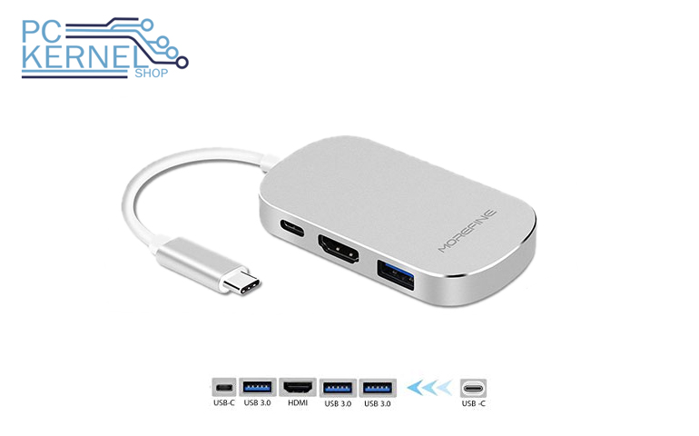 El adaptador cuenta con puerto HDMI para conectar al TV, un puerto USB Tipo C para alimentación y tres puertos USB 3.0 para conexión de dispositivos